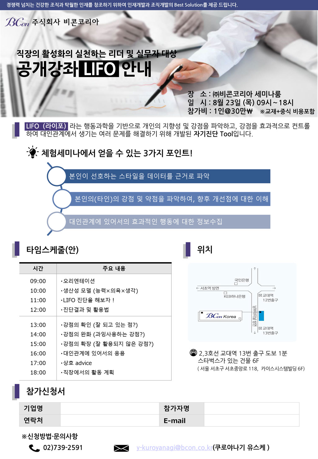 [8월 공개강좌] 직장의 활성화를 위한 LIFO 자기진단 Tool 프로그램 (2018.08.23, 목, 비콘코리아 세미나룸)