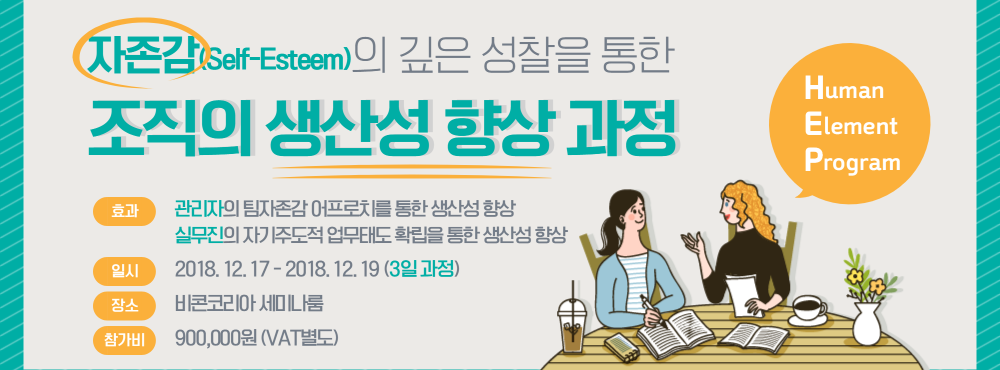 [12월 공개강좌] 자존감(Self-Esteem)의 성찰을 통한 조직의 생산성 향상 과정! HEP! (2018.12.17-19, 비콘코리아 세미나룸)
