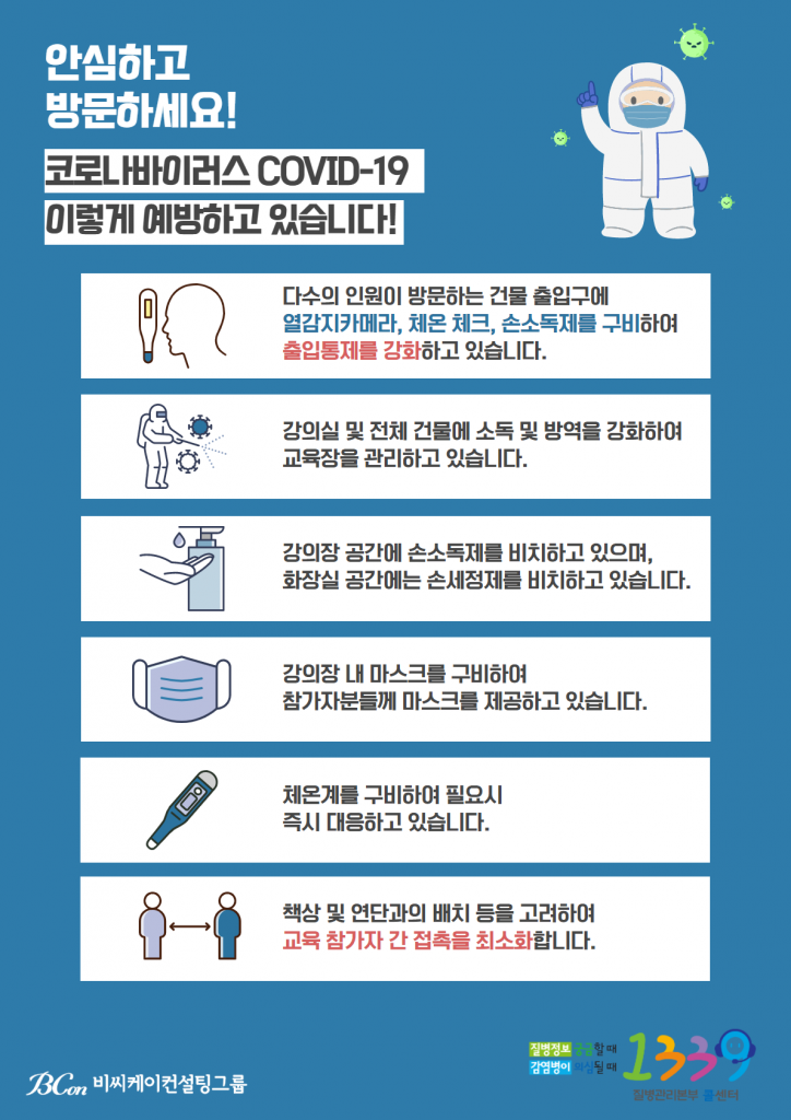 BCK컨설팅그룹은 하기와 같이 코로나바이러스 COVID-19에철저히 예방/대응하고 있습니다!