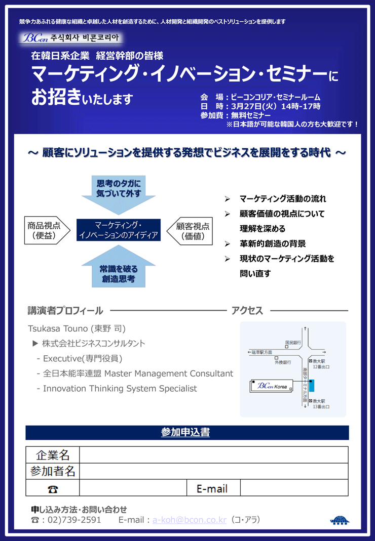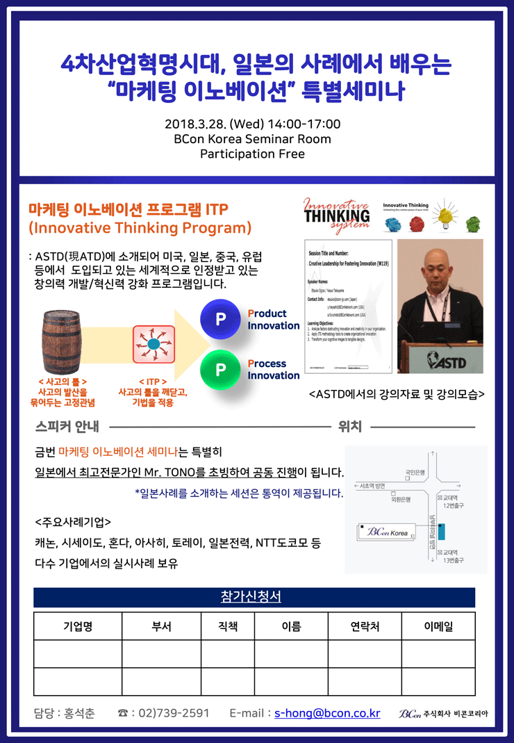 비콘코리아에서 4차 산업혁명시대, 일본의 사례에서 배우는 「마케팅 이노베이션」 특별 세미나를 개최합니다.